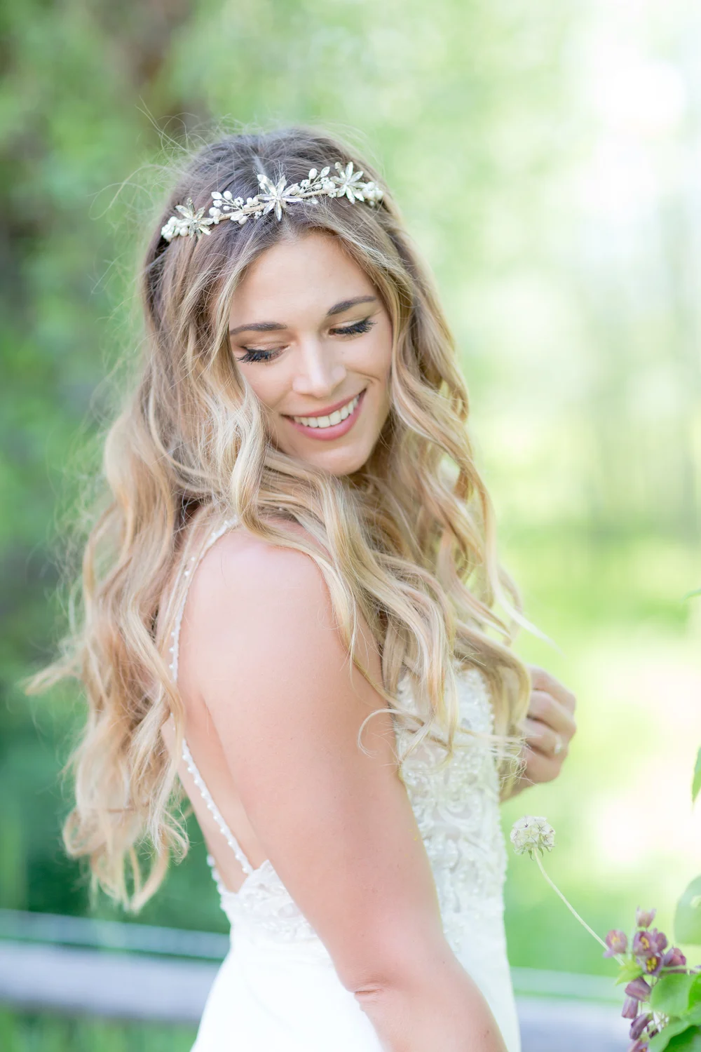 We love a good Real Bride, especially one who is absolutely stunning in Jackson Hole, Wyoming. Cierra, the beautiful bride, is wearing our Elizabeth headband. It has floral studs with pearl accents that was perfectly paired with her Made With Love dress. Thank you, Cierra, for being an Untamed Petals bride. You looking georgous!