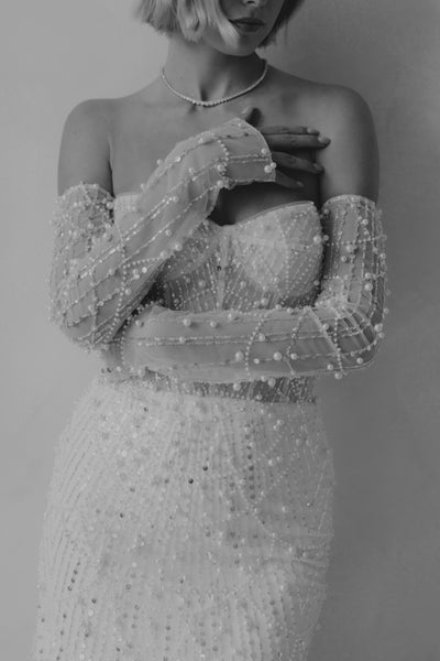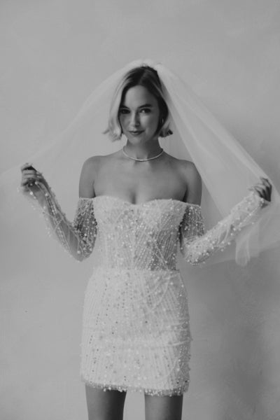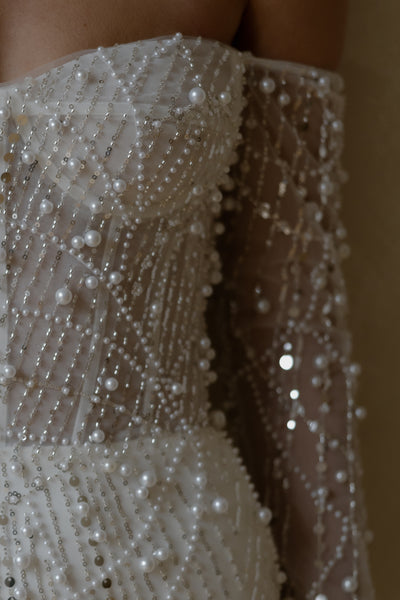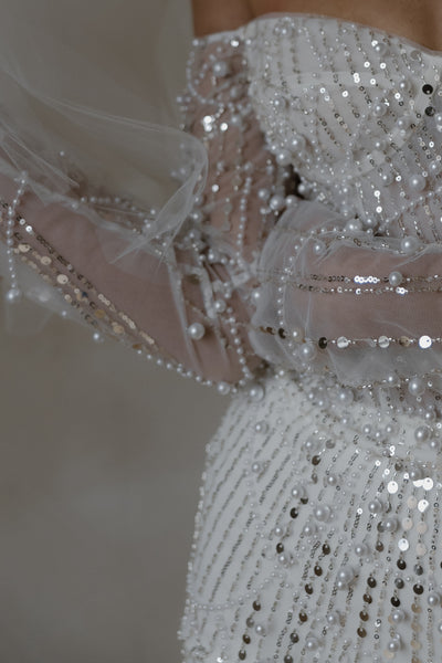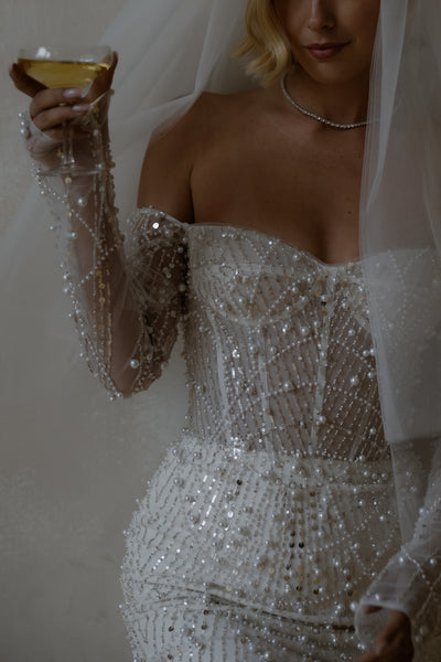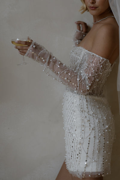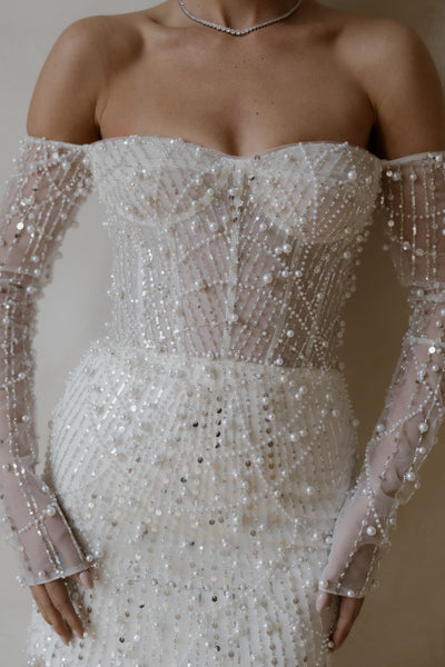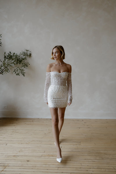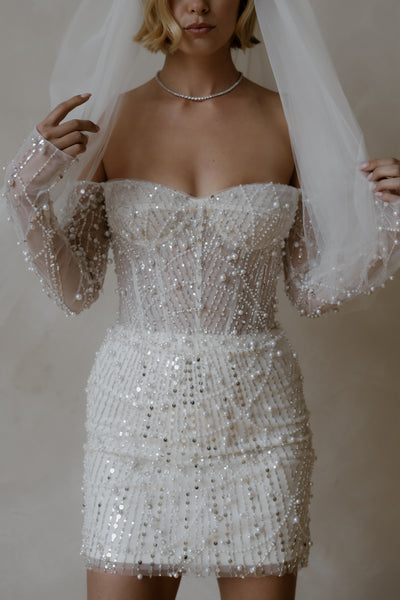 I wish I had the words to describe this dress. The photos online are gorgeous but do not do this dress justice for how absolutely incredible it is in person. The sequins give the dress an incredible sparkle and the pearls give it a classy touch. I was a little nervous because of the store credit return policy and not sure if I’d receive in time but I reached out and was able to snag my size. I got this dress a few days ago and I’ve been thinking about it non stop and I’ve already put it on a few different times just because it’s gorgeous. It fits like a dream but I will have to have the sleeves hemmed a bit since I have shorter arms. This is EXACTLY what I pictured for a reception dress and I can’t believe I found it! I cannot wait to wear it on my wedding day!