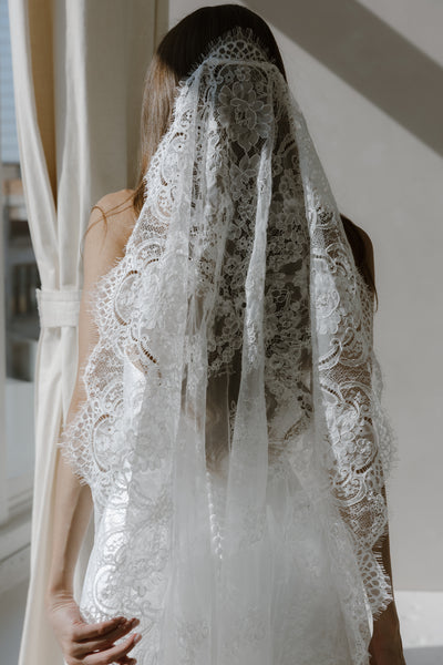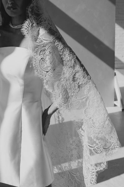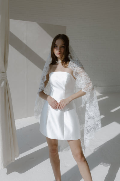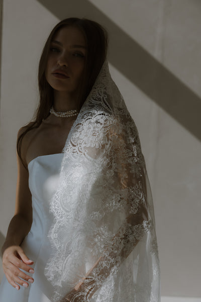 This fingertip-length veil features ornate floral lace appliqué and a romantic scalloped edge, framing your look with soft, timeless elegance. Light and airy, it drapes effortlessly for that perfect aisle moment.