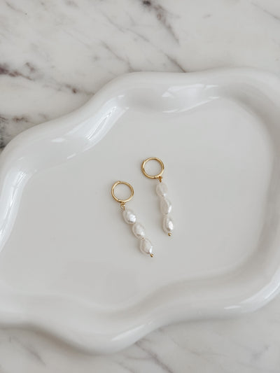 Delicate gold hoops meet a vertical row of organic freshwater pearls, creating a silhouette that feels fresh, minimal, and quietly stunning.