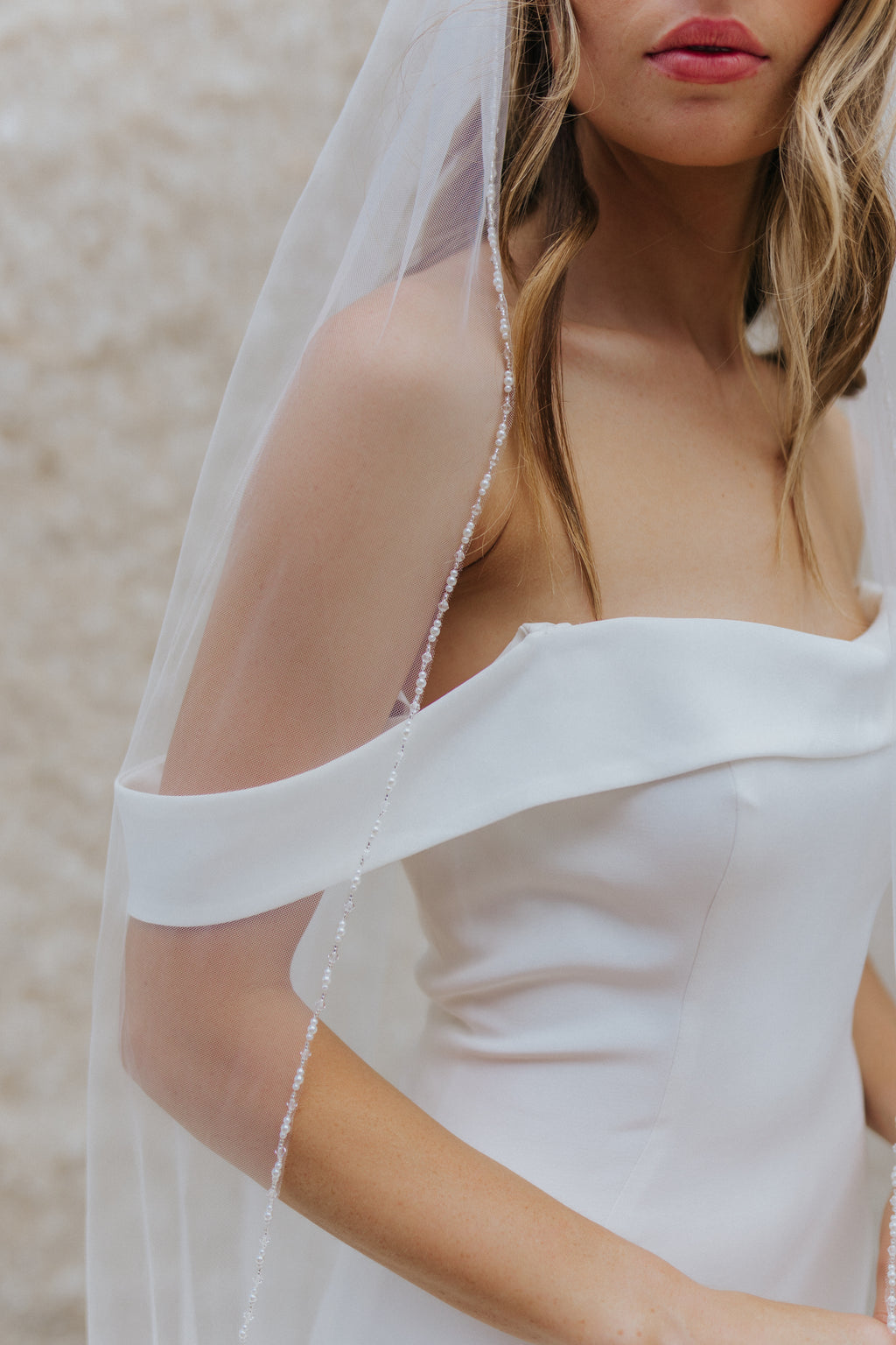 Whitney E. This veil is gorgeous! Originally I planned to purchase my dress's matching veil, but I couldn't stomach the $1,500 purchase and had no idea what I would do. Enter: The Carter Veil. This is the perfect mix of subtle glam and elegance. I have a very intensely floral applique dress and this helps to show it off, while still letting me have my pearl girl moment. Deff recommend!
