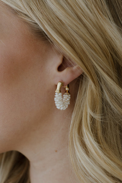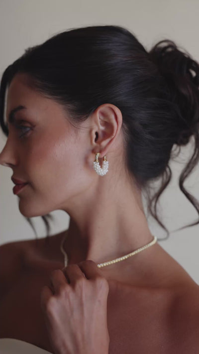 Our Chateau Pearl Hoops feature clusters of dainty freshwater pearls wrapped around a gold hoop base. Chic, sculptural, and perfect for brides who want something a little unexpected.