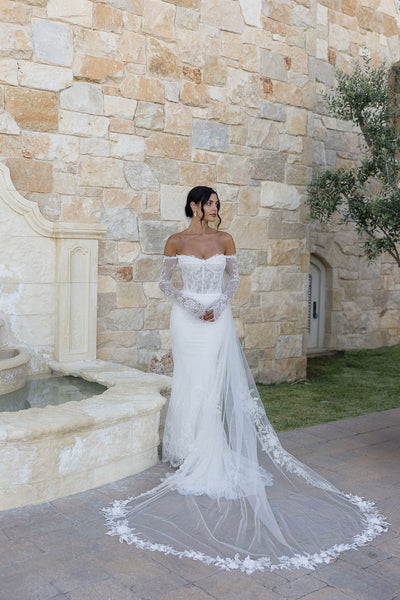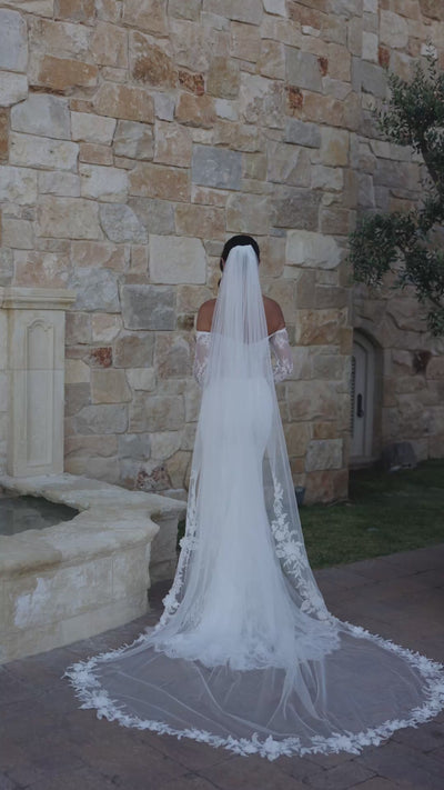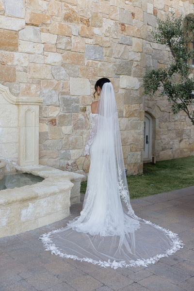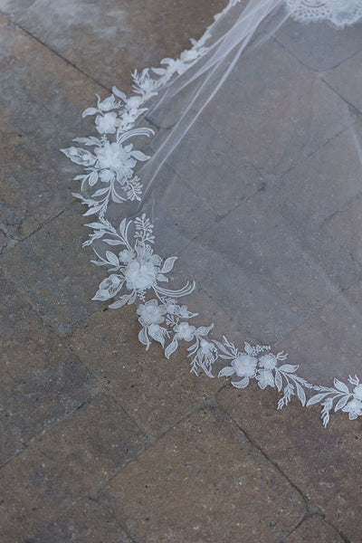 The Cleo Veil is adorned with dramatic floral appliqué blooming along the edge, creating a striking silhouette that floats behind you. Perfect for the bride who wants her entrance to be unforgettable while keeping things soft and romantic.