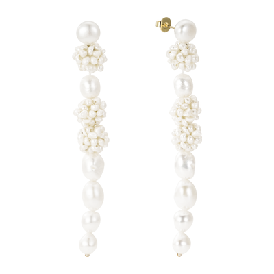 Turn heads on your wedding day with these stunning drop earrings, featuring a beautiful arrangement of freshwater pearls and intricate clusters.