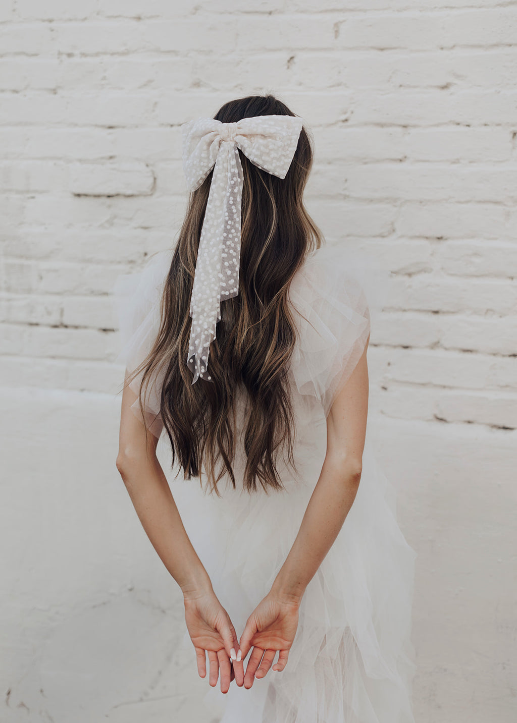 The sweetest swiss dot style bow - style in a pony, braid or on the side of your head. This sweet little bow is perfect for a veil alternative, your rehearsal dinner or a date night on the town with jeans and a white t-shirt!
