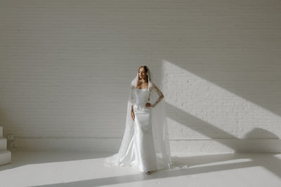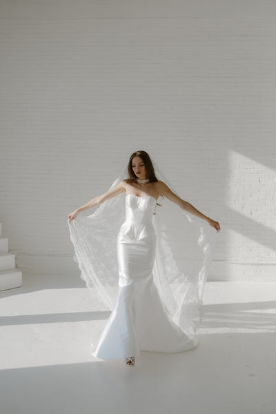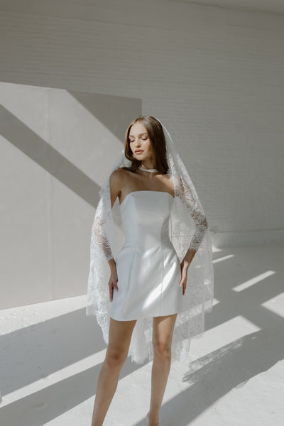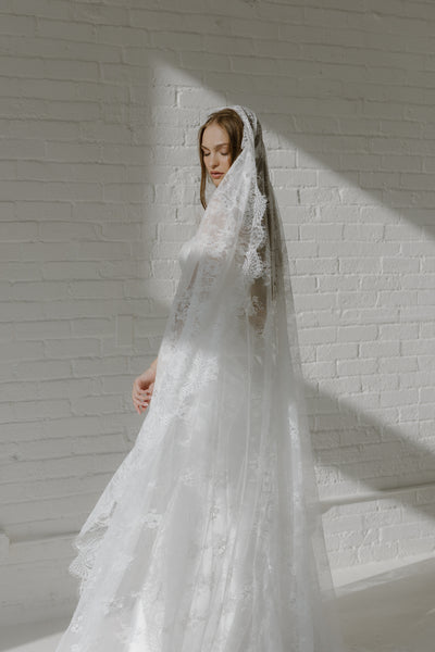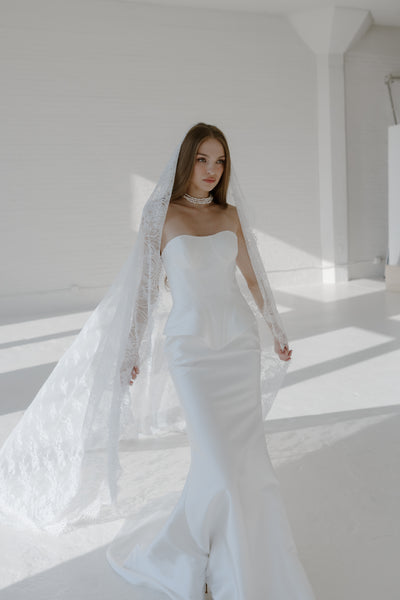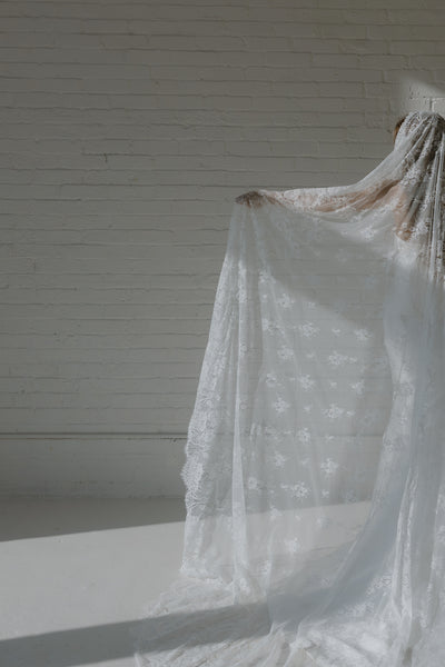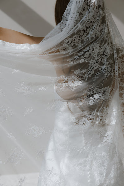 This veil features a cascade of soft floral embroidery that trails into a scalloped lace edge. Perfect for making an unforgettable entrance. Ultra-light and effortlessly romantic.