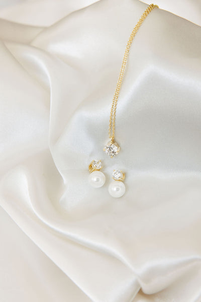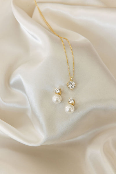 Classic and effortlessly chic, this set pairs the radiant Joelle Pendant, featuring a sparkling solitaire CZ crystal, with our timeless Maven Studs, designed with brilliant stones and pearl drops. Together, they strike the perfect balance of modern simplicity and bridal elegance—ideal for your walk down the aisle and beyond.