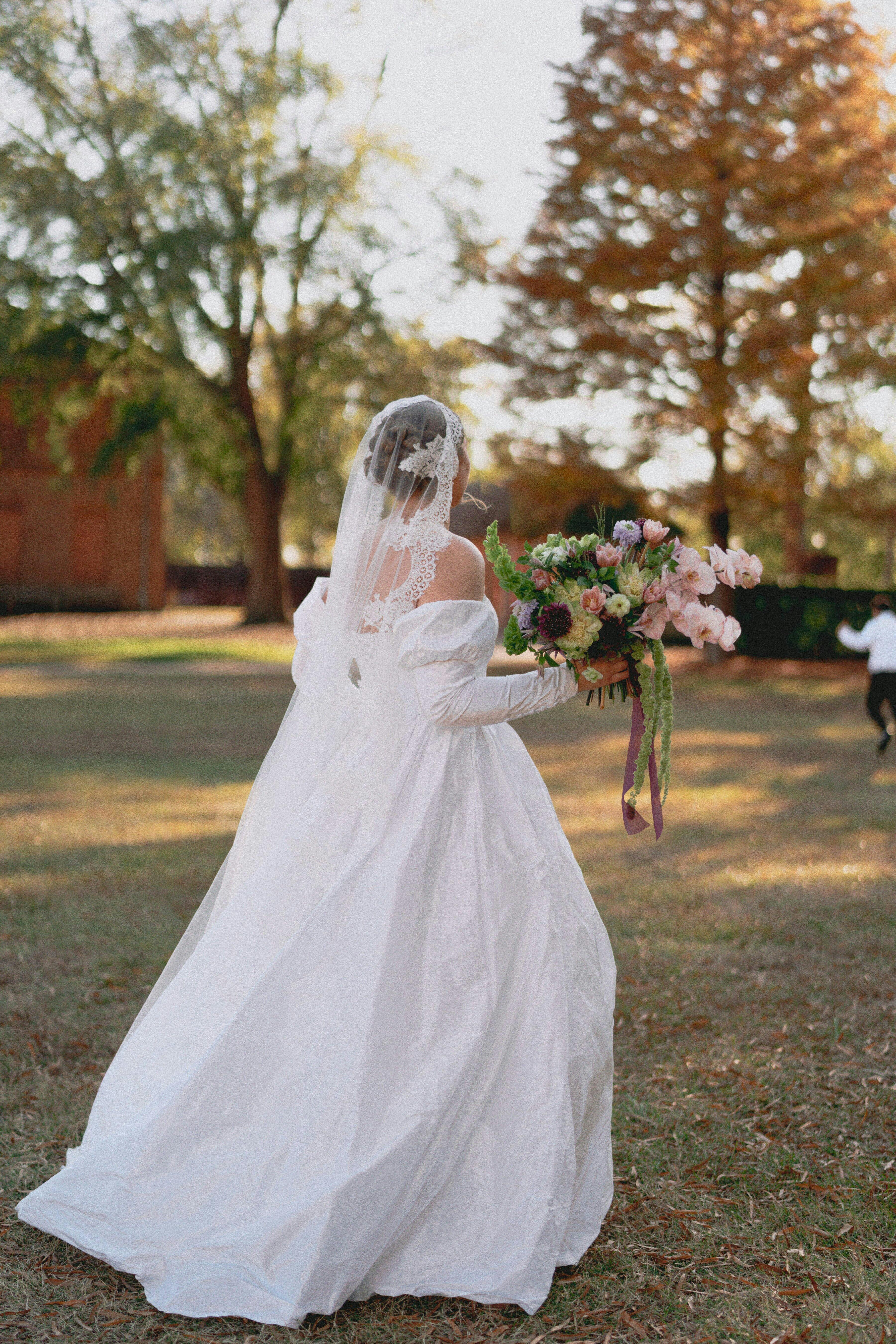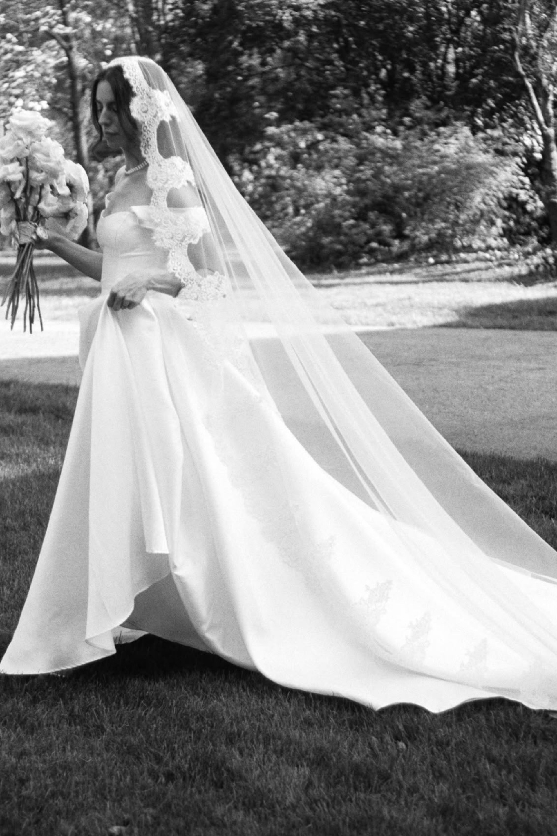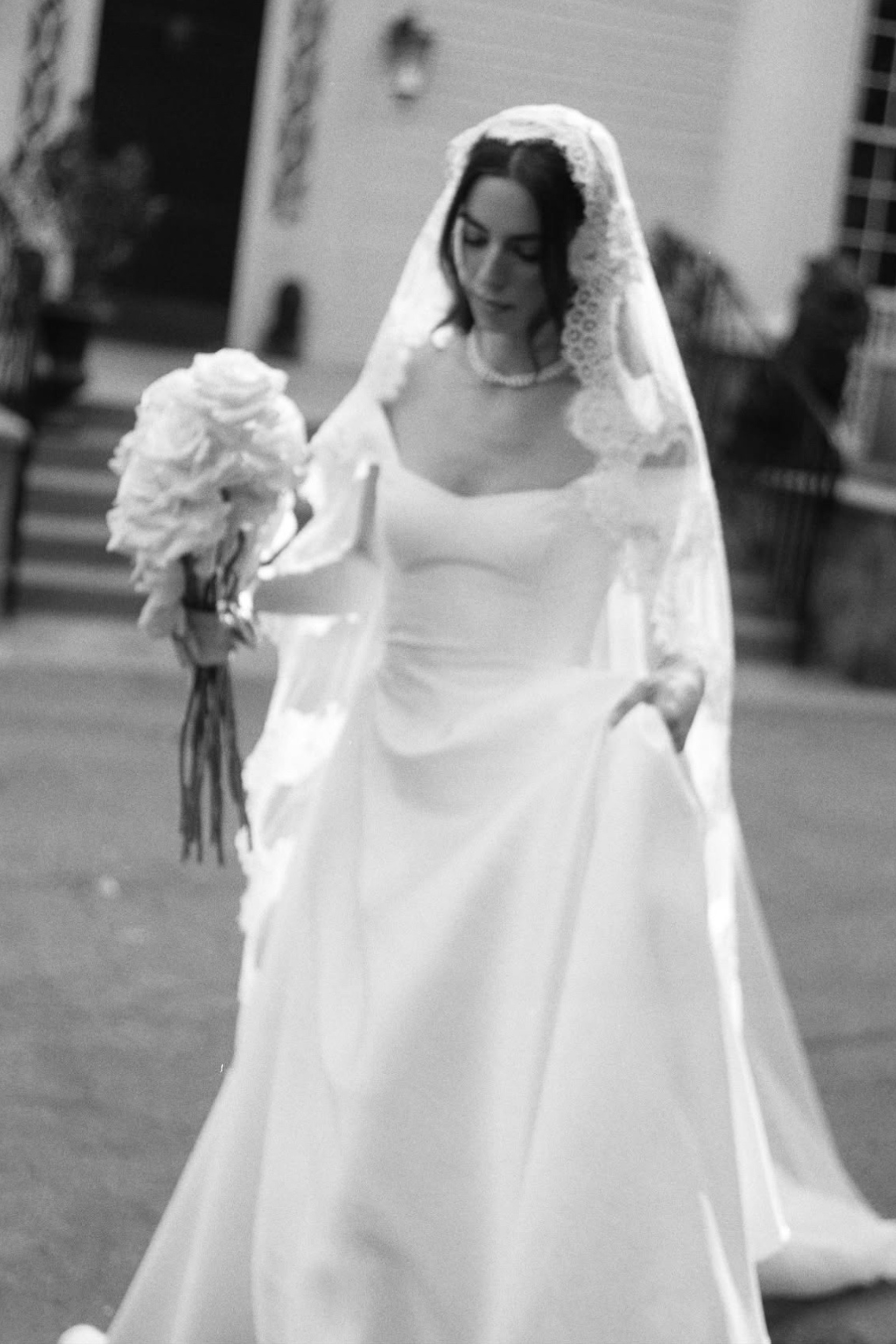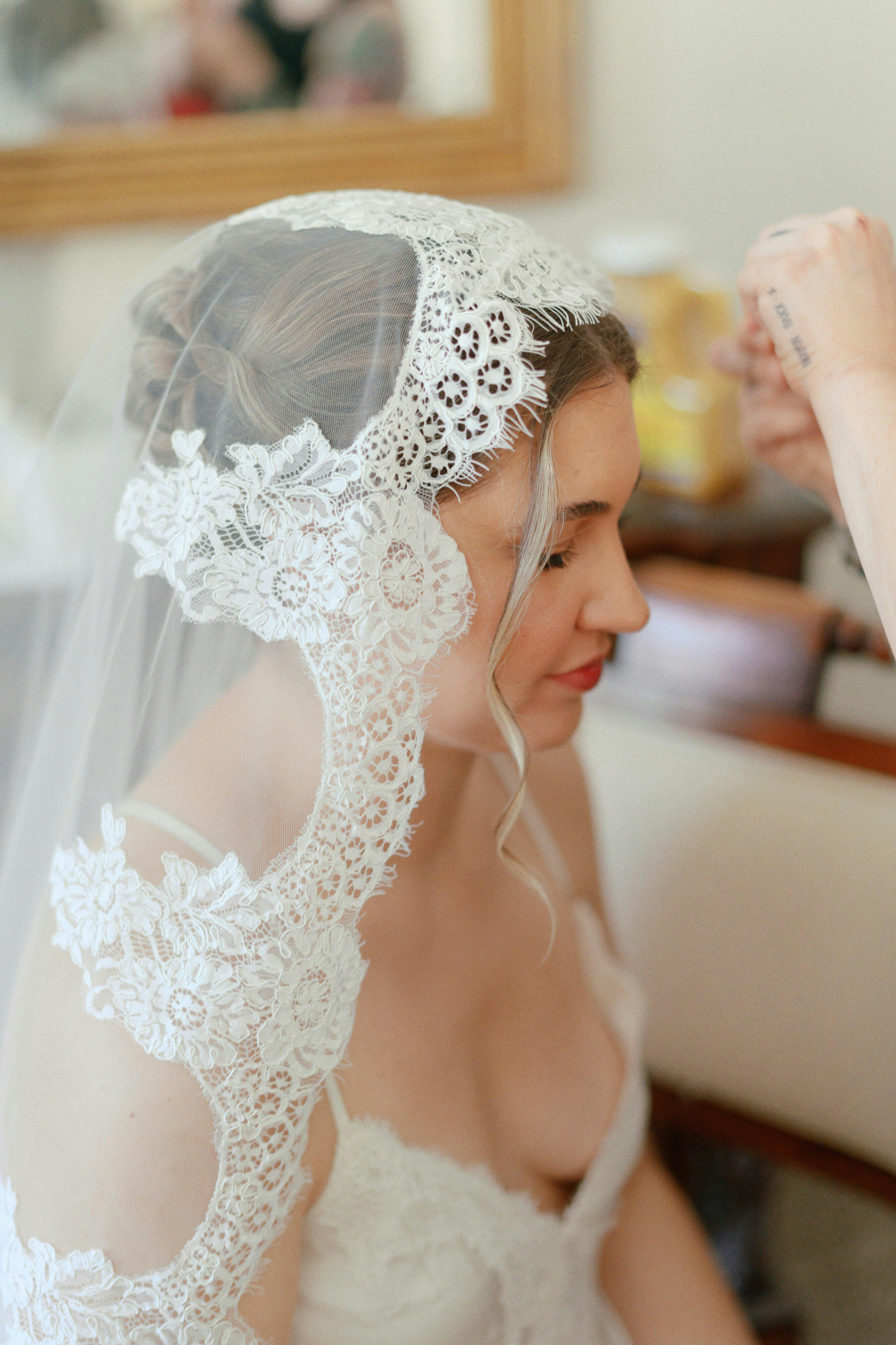 Enhance your bridal look with this stunning mantilla style lace veil, featuring delicate tulle and intricate lace detailing for a timeless, romantic finish. Perfect for creating a dramatic and elegant entrance.