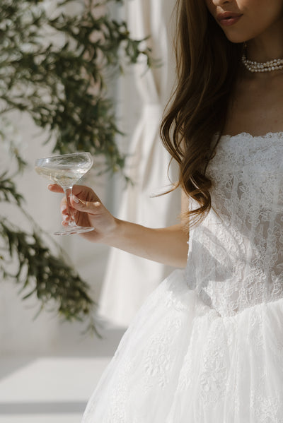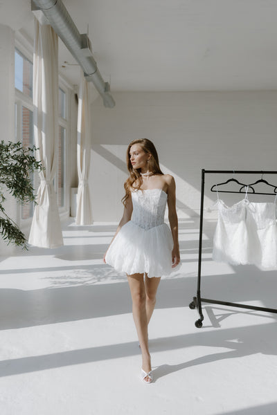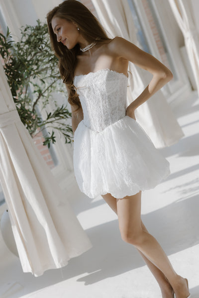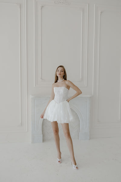Juliette is a lace mini moment with a structured corset bodice and a flouncy bubble skirt made for turning heads. Designed for the bride who’s writing her own rules, this dress is your main character energy wrapped in lace.