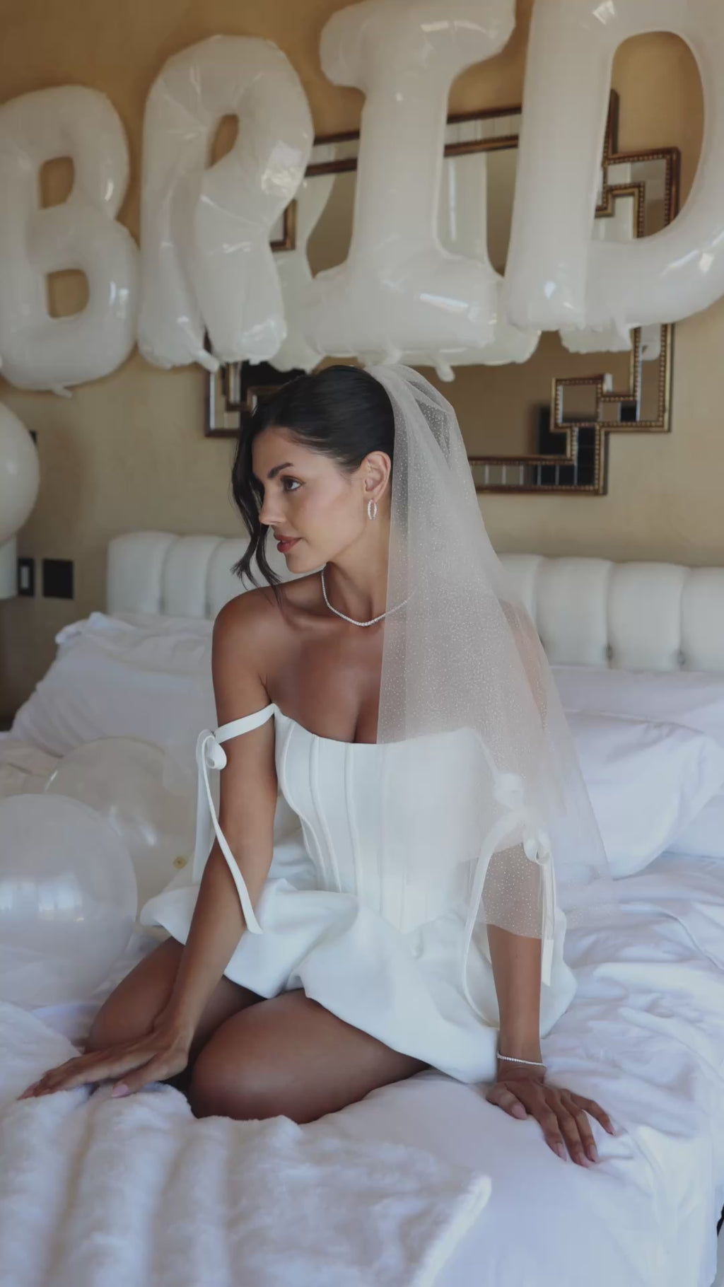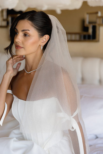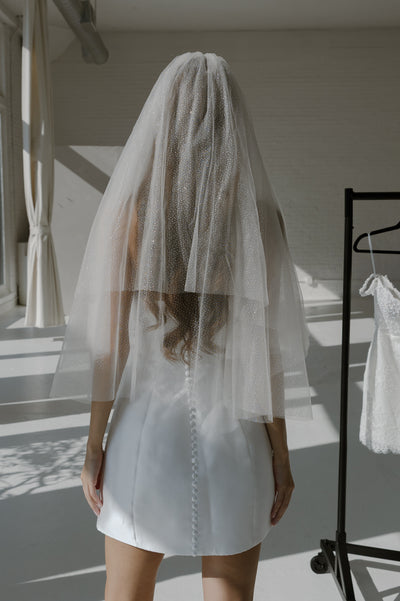 The Last Disco Mini Veil is made from ivory glitter tulle that shimmers with every move. With two tiers for extra volume and drama, it’s the perfect party veil for the bride who’s ready to shine.