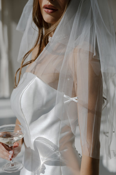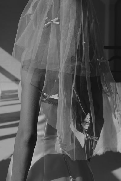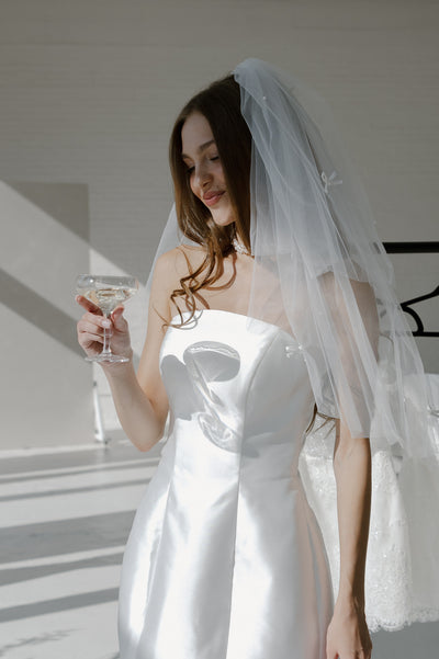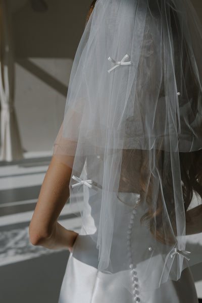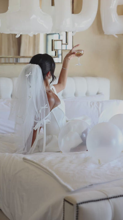 The Last Toast Mini Veil features ivory tulle with delicate fluttering bows throughout. Designed with double tiers and a secure hair clip, it’s perfectly playful for bachelorette mornings, bridal brunches, or any moment you want to feel extra bride.