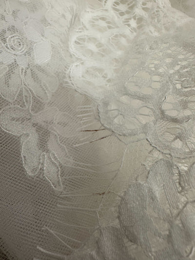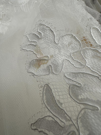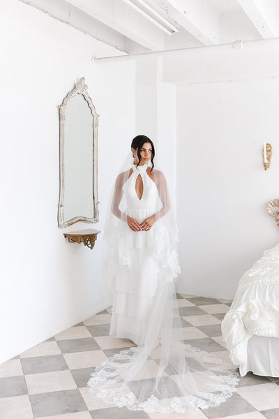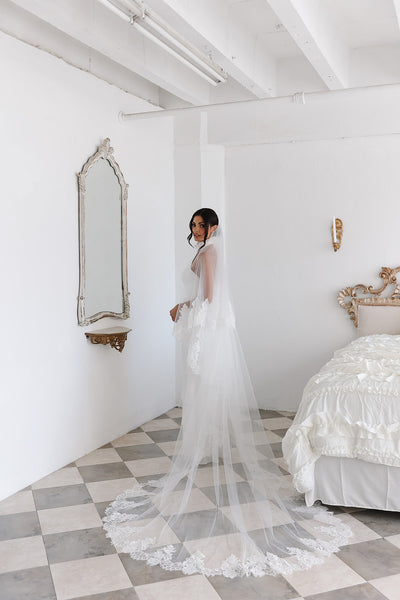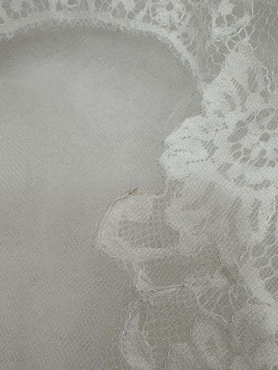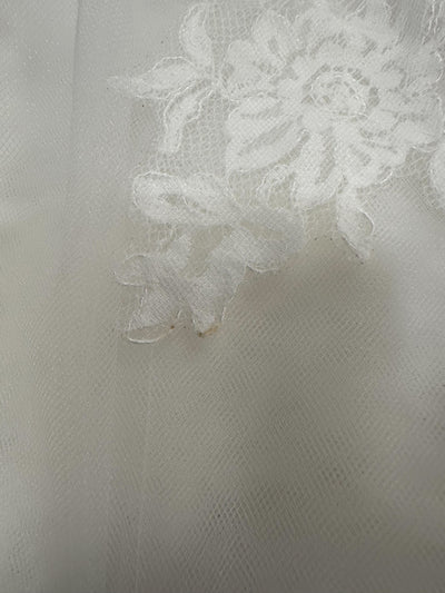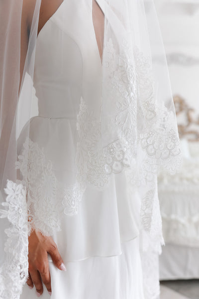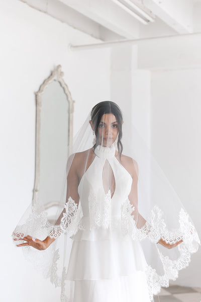 This beautiful lace-trimmed veil offers a classic and elegant touch to your bridal look. With intricate floral lace edging and a graceful drape, it's the perfect finishing piece for a timeless look on your special day.
