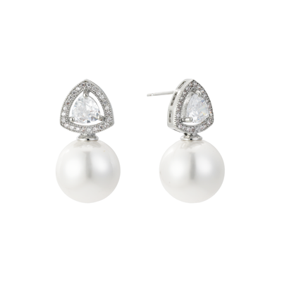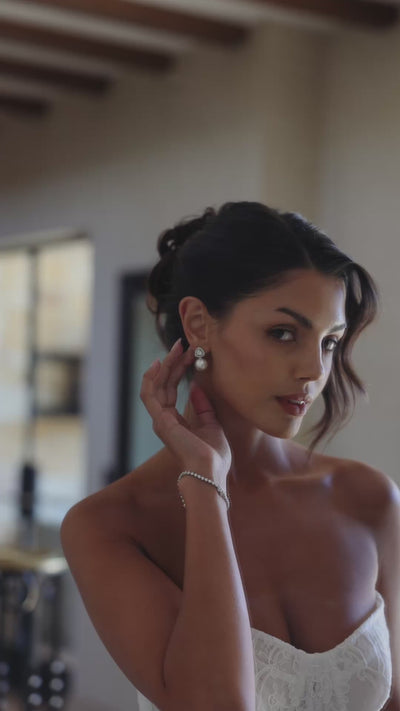 The Legacy Earring showcases a teardrop-shaped crystal framed by a halo of pavé stones, finished with a luminous drop pearl that gives it an heirloom-worthy touch.