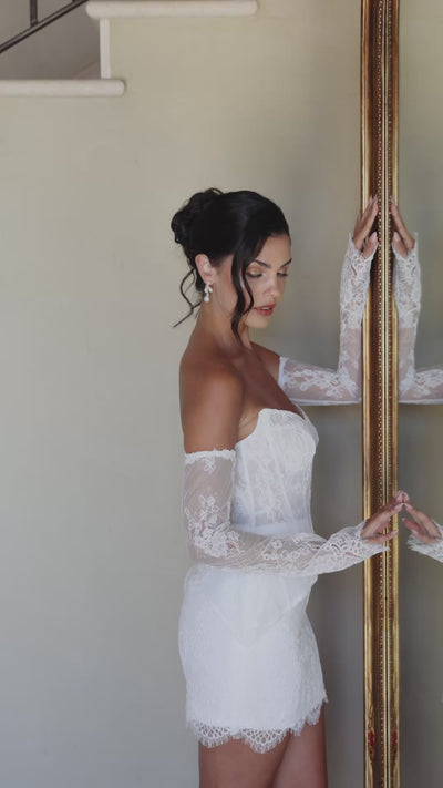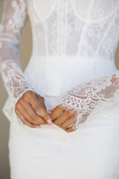 Glove version of our Madeline Dress sleeves featuring floral lace and a soft flared cuff for a touch of vintage elegance.![]()