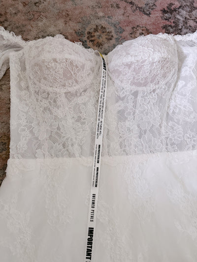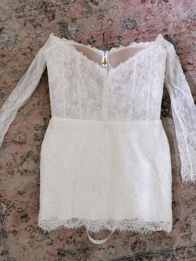The Madeline dress is an off-the-shoulder, long sleeve lace mini that combines structured boning and a sheer lace bodice. Perfect for the bride going for a sexy but elegant bridal look!