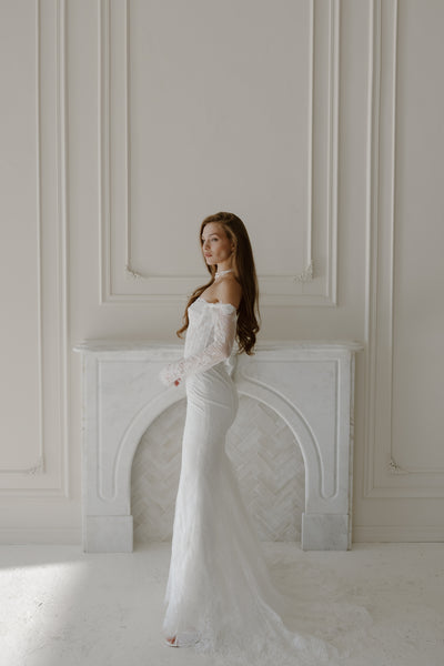 Inspired by our beloved Madeline Mini, the Maeve Gown is our first full-length bridal look designed for the ceremony, an elopement, or wherever your love takes you. Featuring our signature lace and a romantic mini train, it’s effortlessly cool and undeniably bridal.