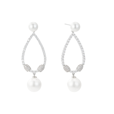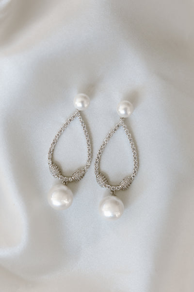 Effortlessly elegant with a hint of drama. The Muse Pearl Drop Earrings feature a classic pearl stud, a sparkling teardrop silhouette, and a bold statement pearl that swings with every step. Perfect for the bride who channels timeless beauty with a modern muse energy.