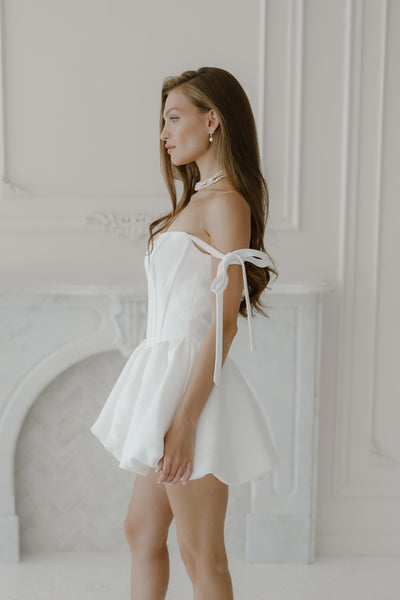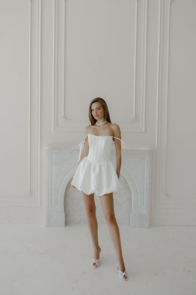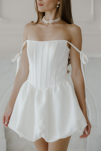 She is THE moment. Muse is your signature bridal look for the party, the pictures, and the champagne-fueled first dance. With a structured crepe corset, playful bubble hem, and sweet tie straps, she’s equal parts flirty and refined.