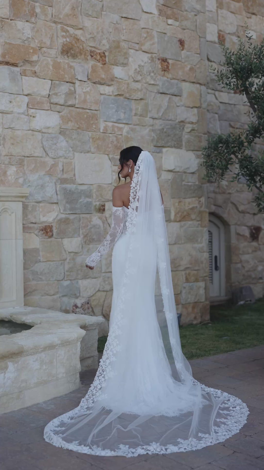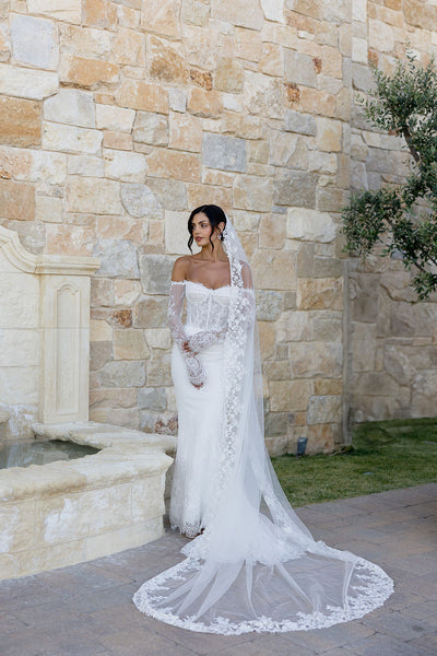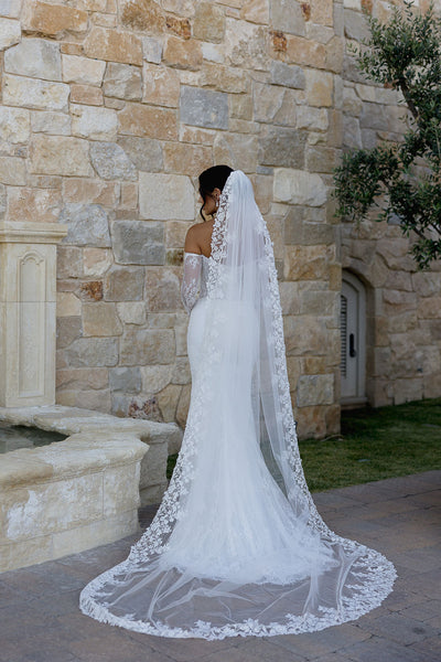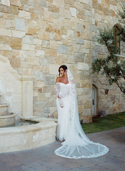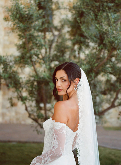 Delicate from every angle. The Posie Veil features soft, airy tulle scattered with petite floral embroidery, forming a blooming border that trails effortlessly behind you. A romantic choice for the bride drawn to quiet beauty and graceful movement.