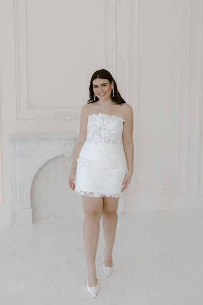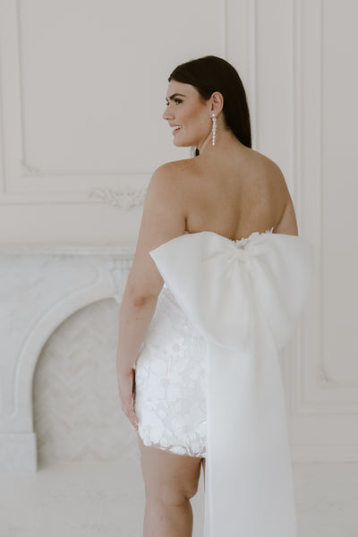 The Rosalie dress is a stunning strapless mini crafted from exquisite floral lace. With boning in the bodice for a flattering fit and a fun, removable big bow on the back, this dress is perfect for the bride who wants to exude elegance and charm at her bridal event.