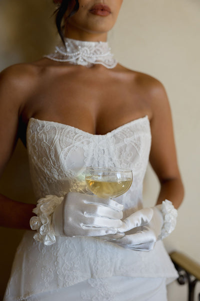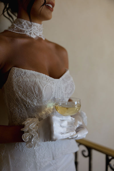 Crafted in silky satin, each wrist is adorned with delicate rosette detailing for the perfect touch of drama and romance. Whether you’re making a statement at the aisle, cocktail hour, or the after party, these gloves are the ultimate finishing touch for the modern bride.