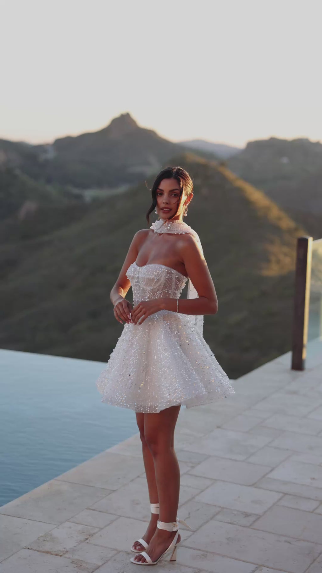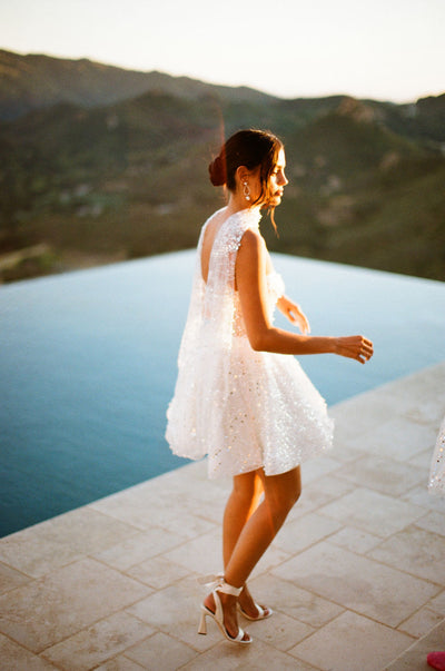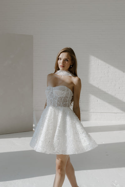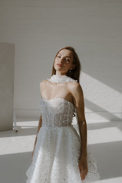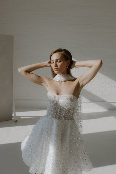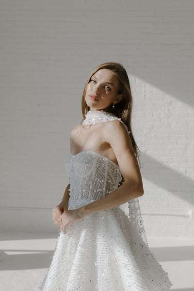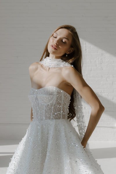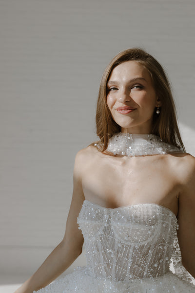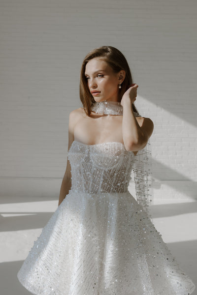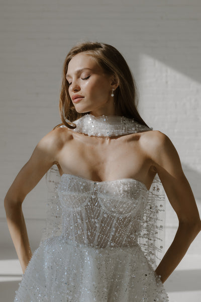 The Siena Neck Scarf is made from soft tulle and adorned with shimmering sequins and luminous pearls, adding an ethereal touch to any bridal look. Tie it around your neck or drape it over your shoulders. The styling options are endless.