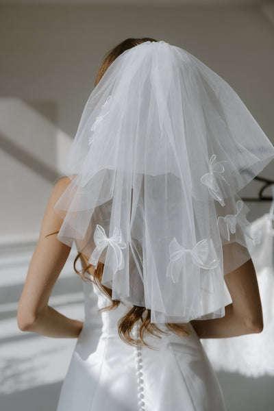 The Tie the Knot Mini Veil features scattered bow appliqués on ivory tulle for the perfect playful twist. With two tiers for added volume and charm, it’s an effortlessly romantic pick for bridal showers, bachelorettes, or your “I do” debut!