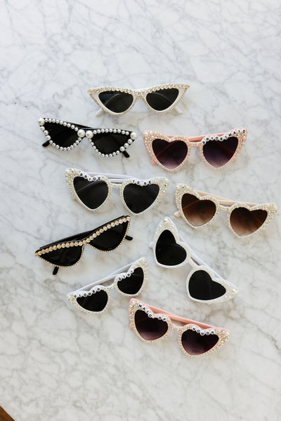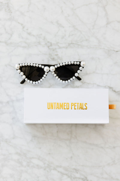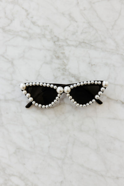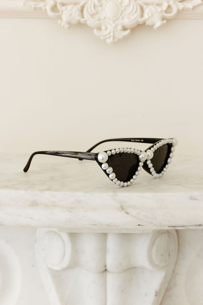 Sleek and edgy black sunnies hand studded with synthetic pearls for an ultra sexy vibe!