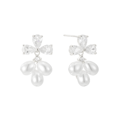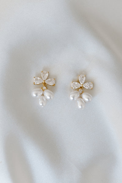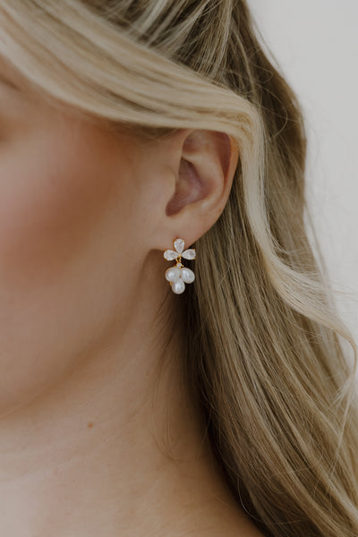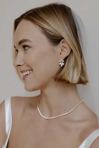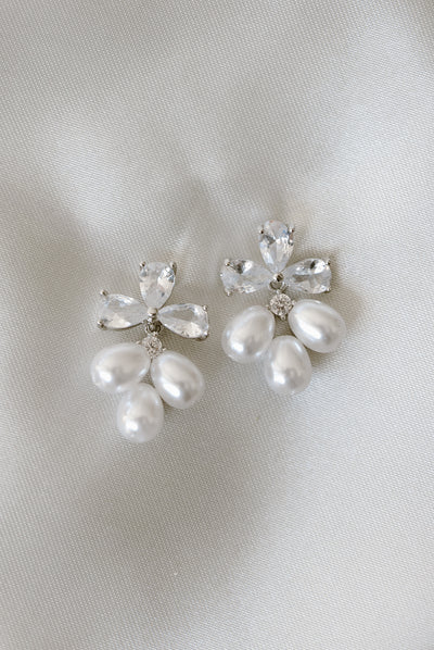 Our Windsor Pearl Drop Earrings feature a trio of shimmering crystals and delicate teardrop pearls, arranged in a floral-inspired silhouette. Equal parts timeless and fresh, they’re the perfect finishing touch for your walk down the aisle, or any moment that calls for a little extra sparkle.